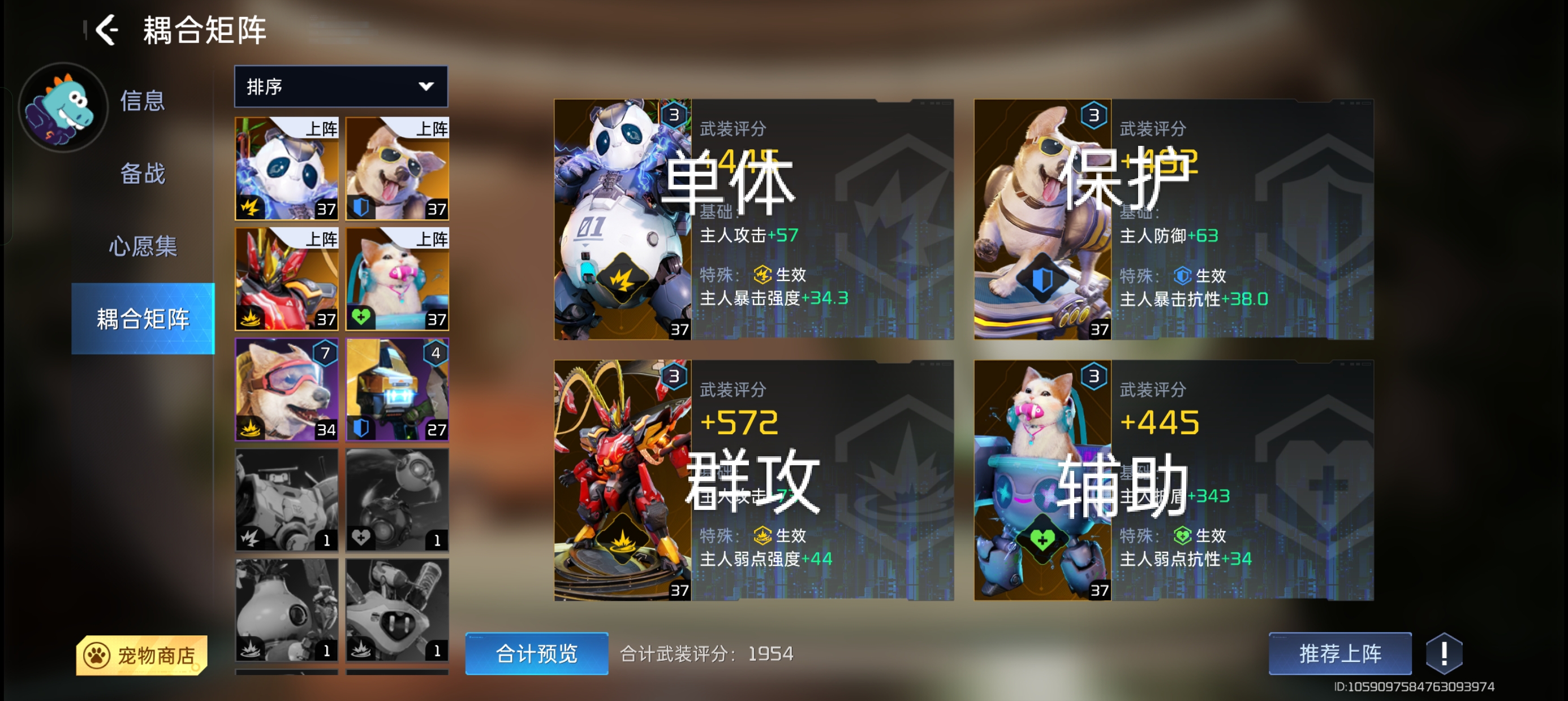 四:宠物–耦合矩阵搭配攻略。最后要说的就是很多玩家没有注意的一个问题宠物的【耦合矩阵】搭配,正确的搭配可以提升很多的战力。之前狮子也是没有特别去注意这个搭配,所以发现评分比别人少很多,问题就是出战在这个【耦合矩阵】搭配上。