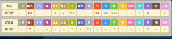 然后来看一下属性,渡龙是飞行系和龙系组合,抵扣了格斗、虫、火、水,弱点弱两倍岩、两倍龙、两倍妖和四倍冰,抵扣方面抵扣了比较热门的格斗和火,弱点方面弱的都是比较热门的,但是特性和专属的存在,让他依旧很强。