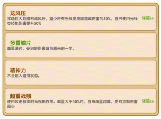 渡龙特性有4个,有3个老特性和1个新特性,今天主要讲多鳞和超重战鳞,多重鳞片属于老特性了,满血时受到攻击时,伤害减半,配合专属效果就是拥有一半血量以上时,受到攻击伤害减半。超重战鳞是属于新特性,首先无视技能副作用,包括能力下降(如使用天龙流星不会下降特功)、陷入混乱、反伤、不能行动(如使用水电炮依旧可以正常行动),然后血量减伤方面,80%血量以上受到克制伤害减伤60%的伤害,在60%-80%血量受到克制伤害时减少45%伤害,在40%-60%血量受到克制伤害减少30%,血量低于40%时受到克制伤害时不减伤。这个特性首先是加强了渡龙的输出,如水电炮、爆炸燃烧这些高威力技能,无副作用的高威力技能弥补了渡龙的打击面以及伤害方面的问题,减伤方面相比老特性的直接减伤,新特性是需要受到克制伤害才会减伤,所以相比多鳞的直接减少伤害会弱一些,所以新特性偏向于输出 专属可以说是渡龙的灵魂,没有专属的渡龙如同吃方便面没有调料包,虽然渡龙专属在测试过程被去除了无效落拳,不过只要避开有可能携带落拳的宠物即可。