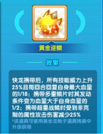来看一下渡龙专属效果,渡龙携带之后,所有技能威力增加25%,然后每回合回复自身血量十八分之一,携带多鳞特性时,拥有50%血量以上时,受到攻击减少一半伤害,携带超重战鳞时受到非克制的属性伤害减少25%,走辅助的渡龙推荐戴老特性多鳞,因为老特性无论对面技能是否克制自己,只要血量高于一半都会减伤50%伤害,新特性刚才说了,偏向于输出,首先新专属技能威力也有所增加,然后新特性受到非克制自身的技能属性时,只有25%的减伤,相比老特性减少了一半,要注意,新特性要受到克制伤害才能减伤,而专属是受到非克制伤害减伤25%。