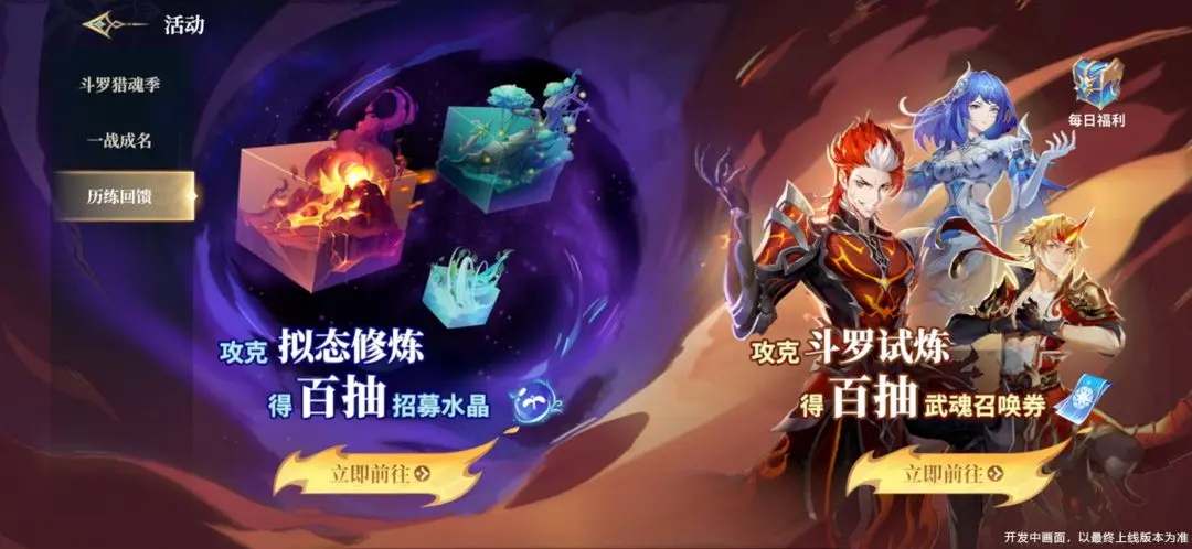 活动期间,通过挑战副本,拟态修炼可获得大量招募水晶;挑战斗罗试炼,可获得大量武魂召唤劵。