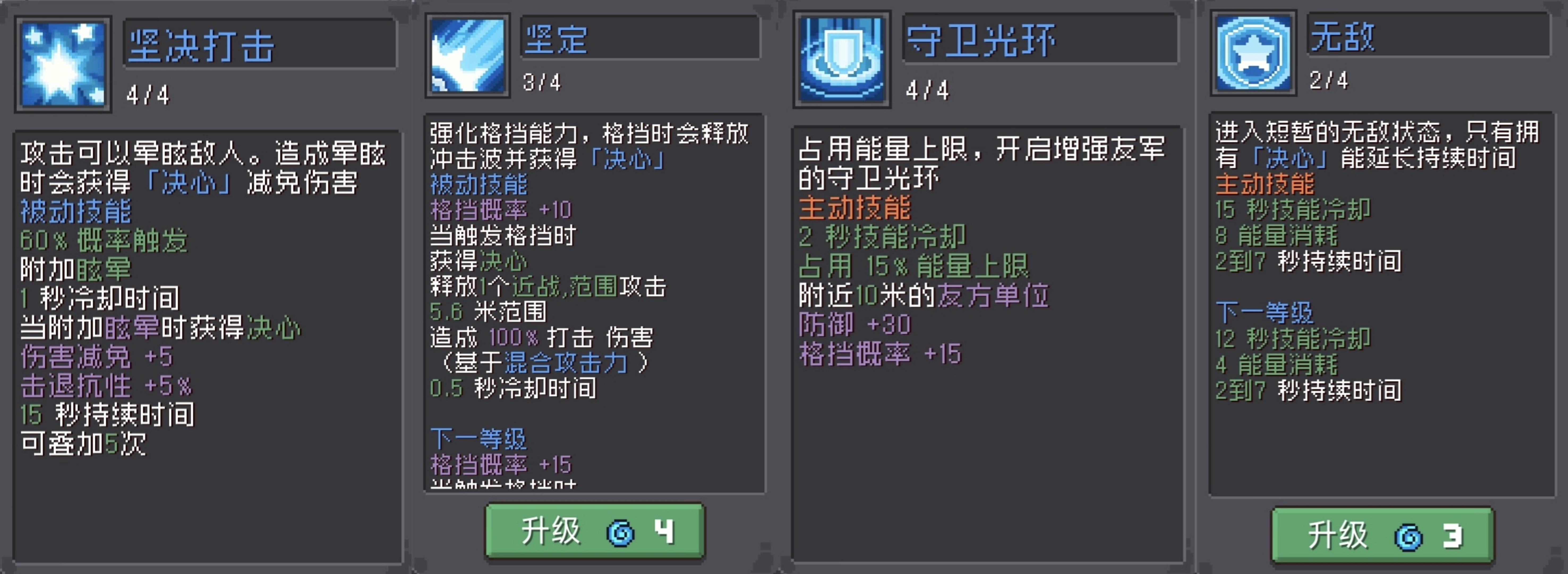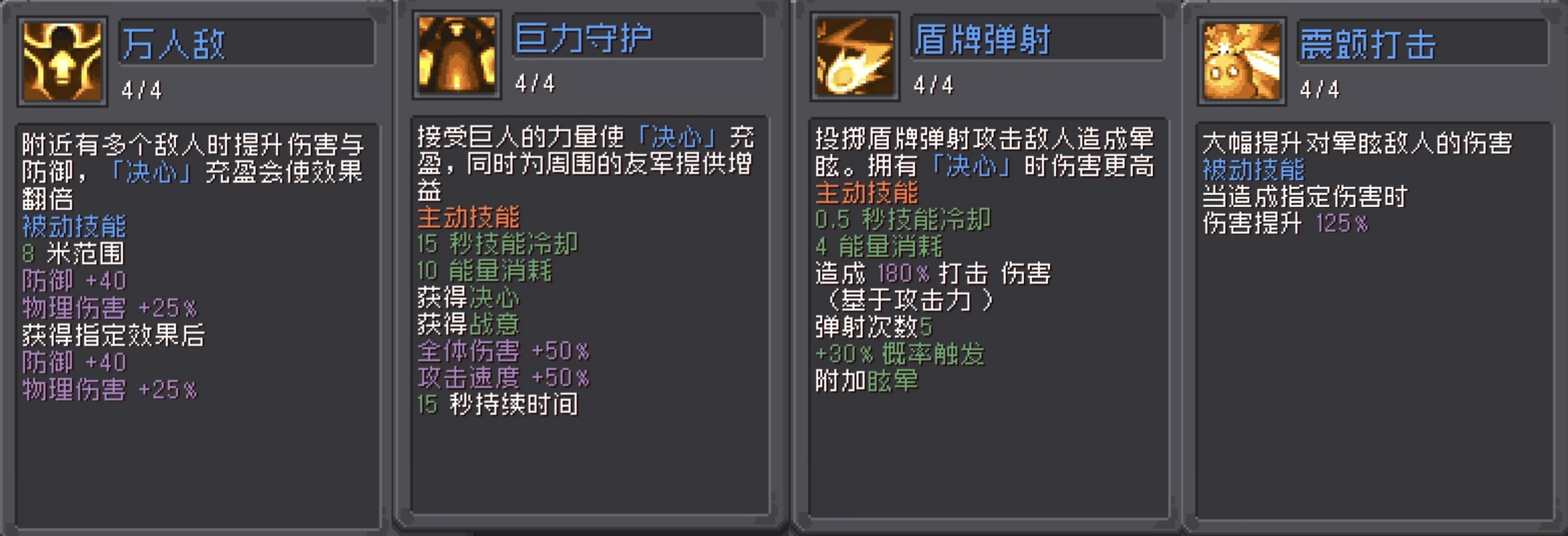 万人敌:[决心]充盈使效果翻倍!+40的防御和+25%物理伤害让你有满满的安全感!