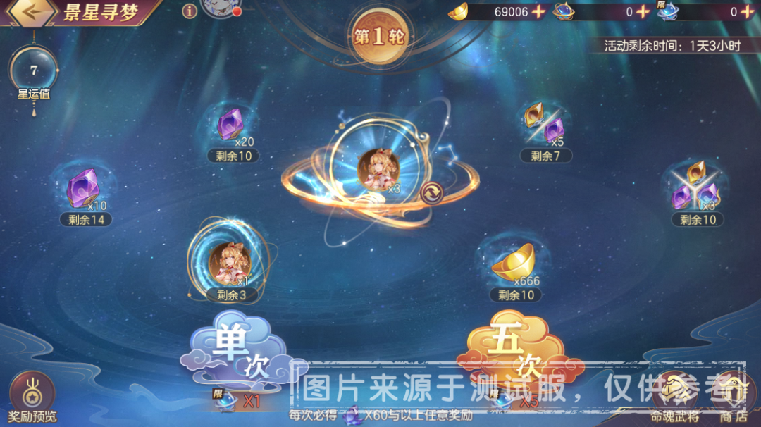 祈愿时将消耗活动限定道具「辰星金轮」、「辰星银轮」其中之一,每次祈愿必定获得「辰星碎片」*60以及奖池中的命魂觉醒信物、命魂进阶养成材料、元宝等稀有资源。