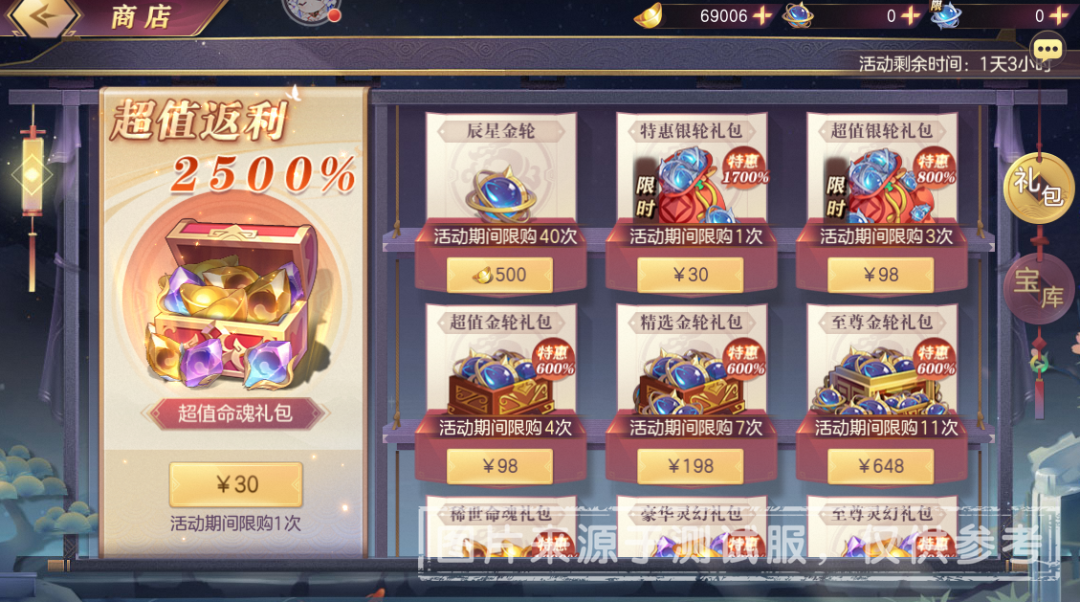 至尊灵幻礼包:内含灵幻命魂石*520、元宝*6480,售价648元,活动期间限购4次。