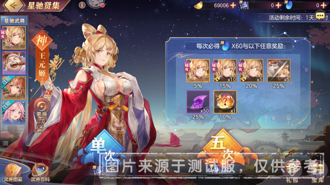 小将军们每次招募,必当额外获得「英杰宝珠」*60,在活动宝库中可兑换「王元姬碎片」、「许褚碎片」、「无双觉醒石」、「随机神将将魂」等奖励。