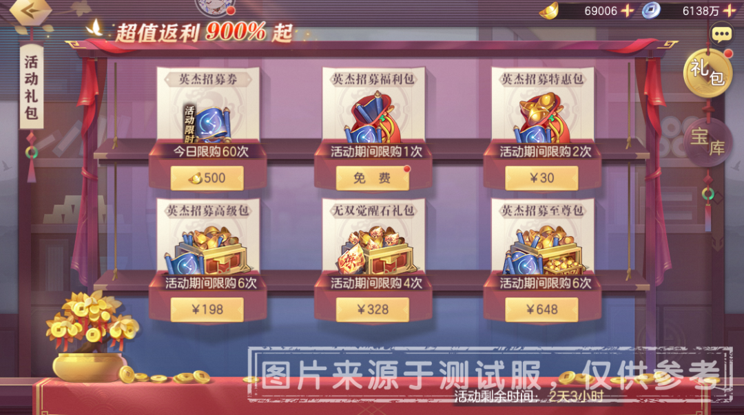 英杰招募至尊包:内含英杰招募券*60、元宝*6480,售价648元,活动期间限购6次。