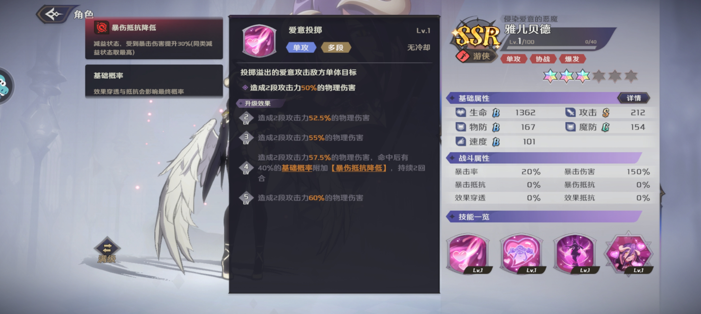 红雅定位是:单攻+协战+爆发。①红雅1技能为:【爱意投掷】对敌方单体目标造成2段的物理攻击,并且4级以后有几率会附带暴伤抵抗降低的效果,可以让敌人受到的暴击伤害大幅度提升。