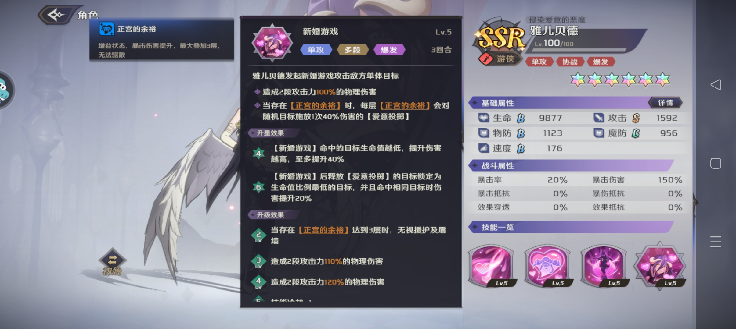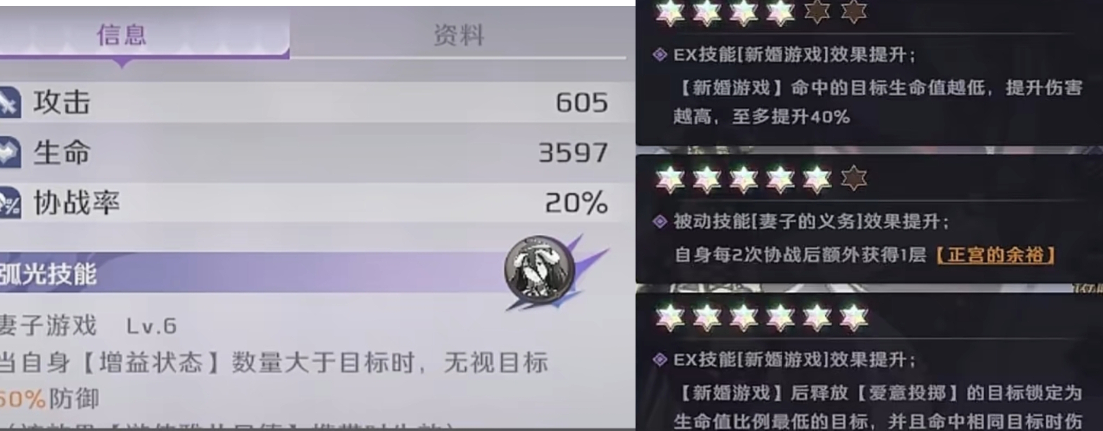 ④红雅的4技能为【新婚游戏】主要效果是对敌方单体造成2段100%伤害,同时存在自身专属的buff(正宫的余裕),每一层buff都会对随机敌人造成一定攻击力的伤害。