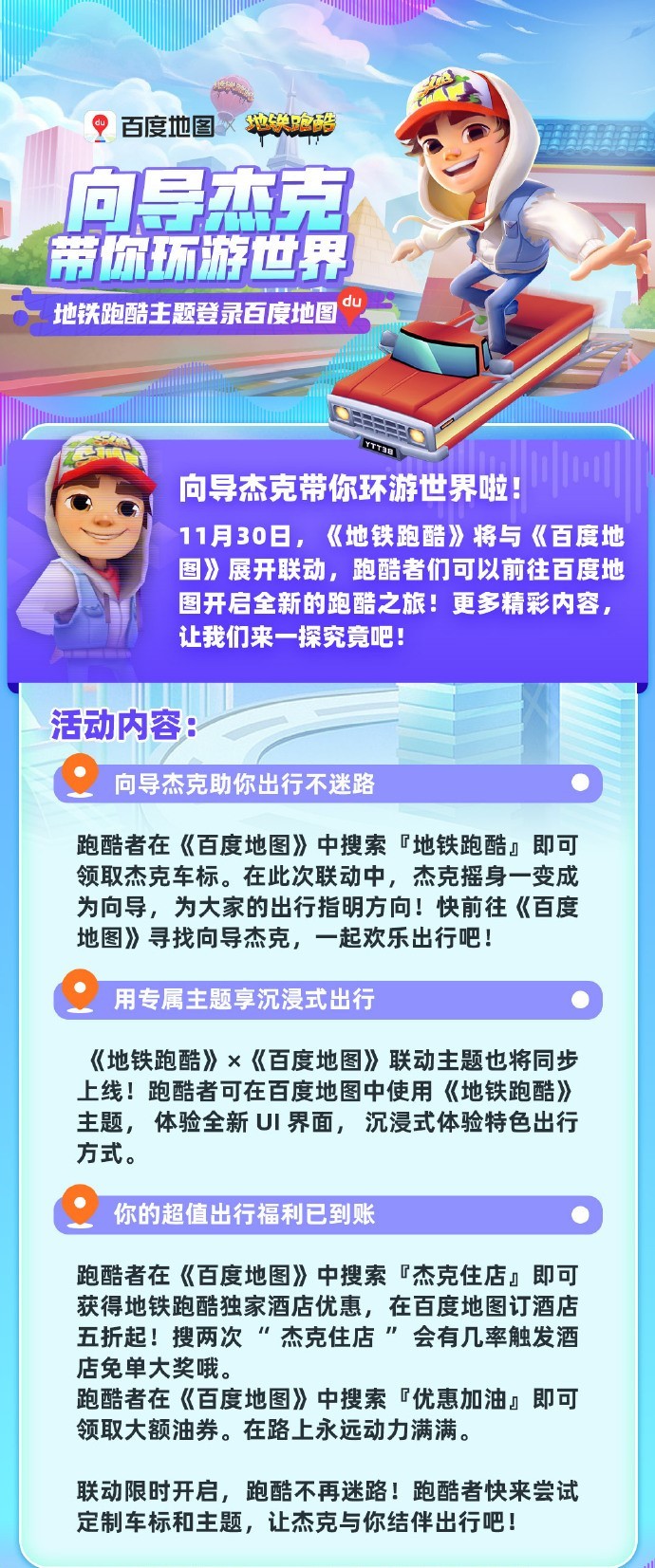 《地铁跑酷》x《百度地图》开启联动!光环-小Y发布于 2023-11-29关注向导杰克带你环游世界啦!从11月30日起,《地铁跑酷》将与《百度地图》展开联动,跑酷者们在《百度地图》中,搜索【地铁跑酷】即可领取杰克车标奖励!联动限时开启,跑酷不再迷路!跑酷者快来尝试定制车标和和主题,让杰克与你结伴出行吧!