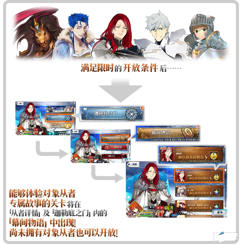 ※未在限时开放期间时间结束之前通关对象从者的「幕间物语」的情况下,在限时开放时间结束后,对象从者的「幕间物语」将变回未开放的状态,开放条件也变回通常的开放条件。