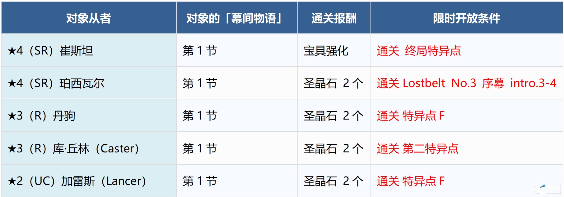 ※满足限时开放条件通关「幕间物语」时尚未拥有对象从者的情况下,在获得对象从者时将反映强化的内容。