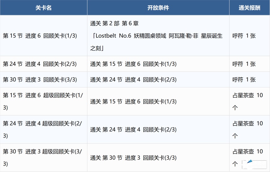 通关第2部 第6章「Lostbelt No.6 妖精圆桌领域 阿瓦隆·勒·菲 星辰诞生之刻」后可以挑战的、集合第2部 第6章「Lostbelt No.6 妖精圆桌领域 阿瓦隆·勒·菲 星辰诞生之刻」中令人印象深刻的关卡的「回顾关卡」开放!