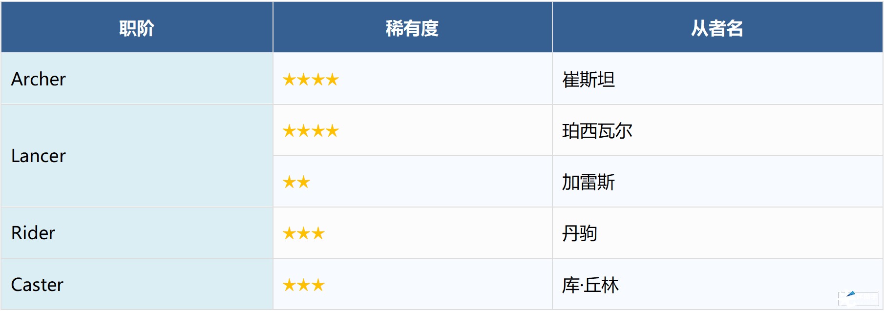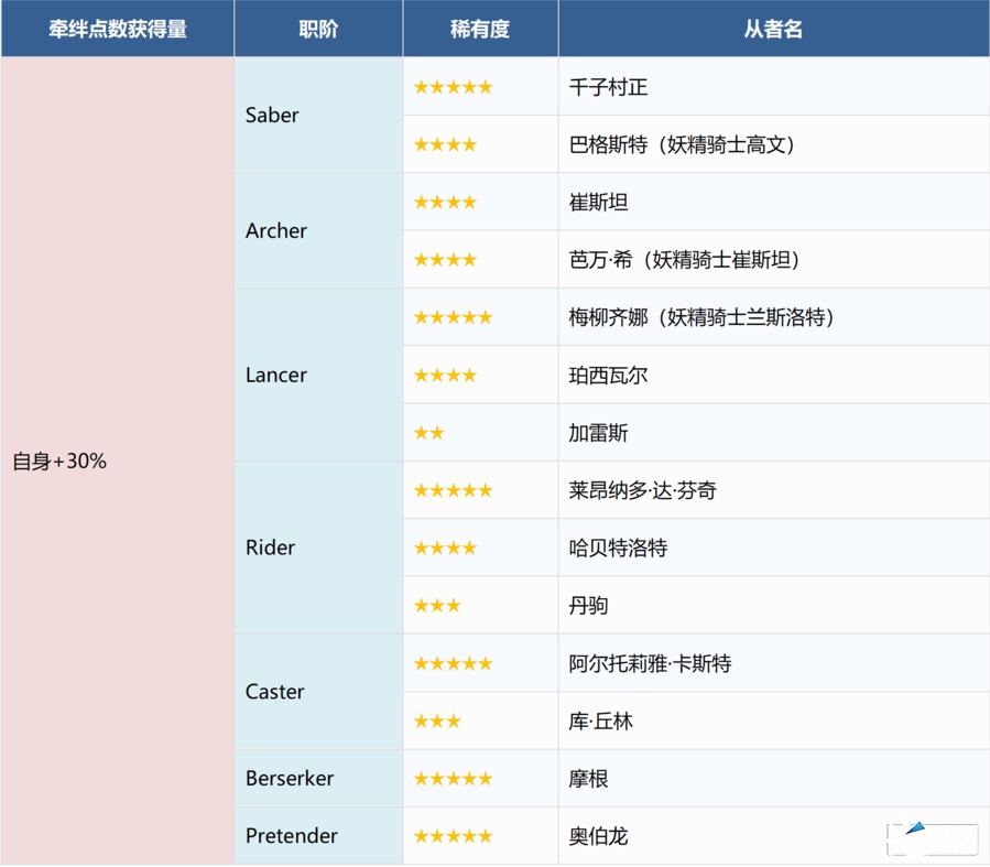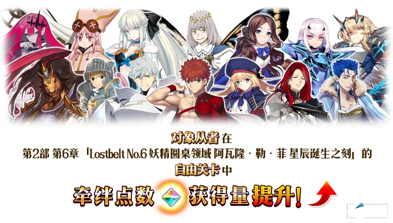 在本次活动的期间内,下表中的从者在第2部 第6章「Lostbelt No.6 妖精圆桌领域 阿瓦隆·勒·菲 星辰诞生之刻」的自由关卡中,将获得「牵绊点数获得量提升」的加成效果!