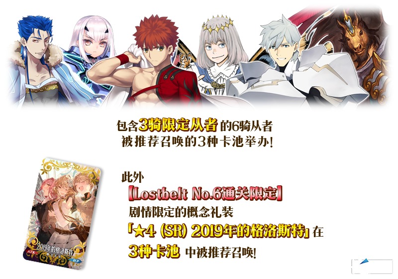 ※只有在通关第2部 第6章「Lostbelt No.6 妖精圆桌领域 阿瓦隆·勒·菲 星辰诞生之刻」的情况下,剧情限定的概念礼装「★4(SR)2019年的格洛斯特」才会在本卡池中出现且被推荐召唤。