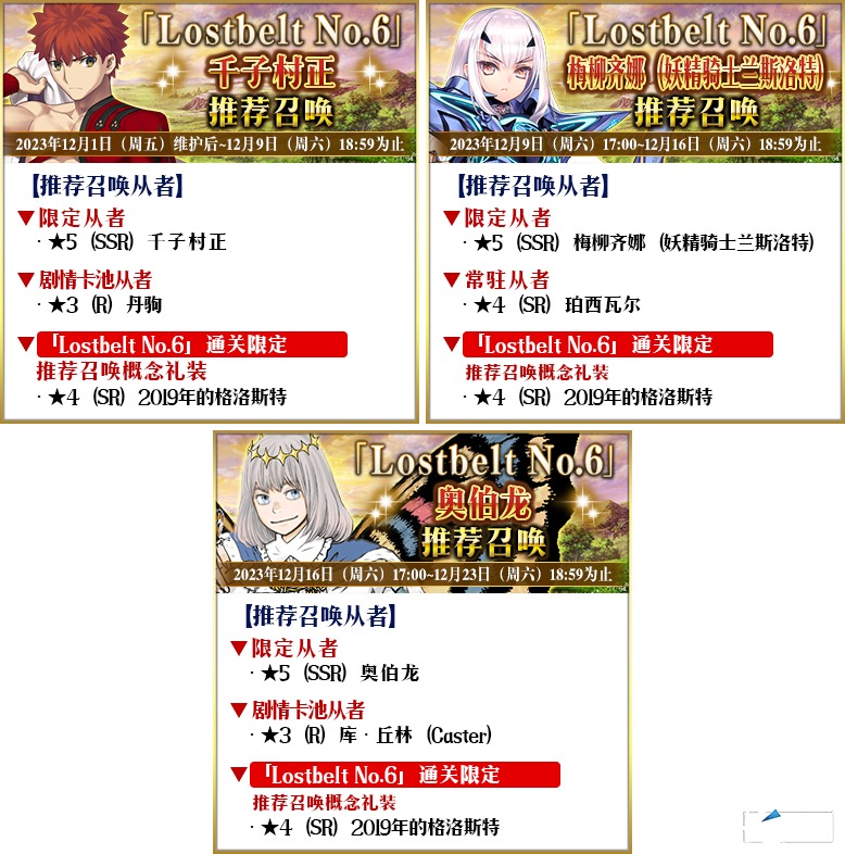 推荐召唤「Road to 7 [Lostbelt No.6」的相关从者中包含限定从者「★5(SSR)千子村正」「★5(SSR)梅柳齐娜(妖精骑士兰斯洛特)」「★5(SSR)奥伯龙」的6骑从者的3种卡池举办!
