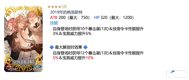 在通关第2部 第6章「Lostbelt No.6 妖精圆桌领域 阿瓦隆·勒·菲 星辰诞生之刻」之前「★4(SR)2019年的格洛斯特」不在推荐召唤的对象之内,也不会在本卡池中出现。