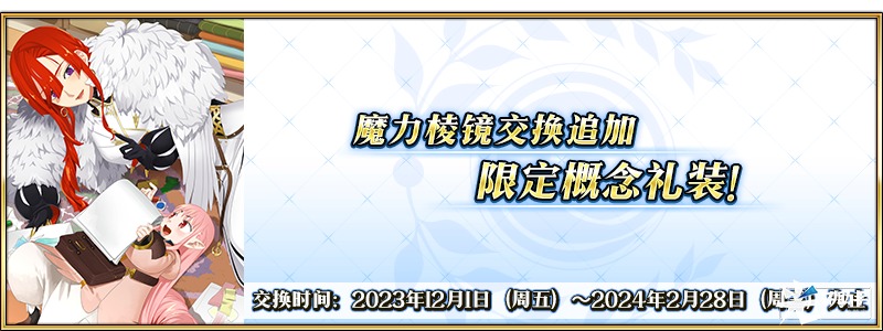 魔力棱镜交换追加限定概念礼装!勤勉搬运的后辈君发布于 2023-11-30关注2023年12月1日(周五)维护后,达·芬奇工房内的「魔力棱镜交换」中限时追加以下概念礼装。◆概念礼装交换时间◆2023年12月1日(周五)维护后~2024年2月28日(周三)23:59为止