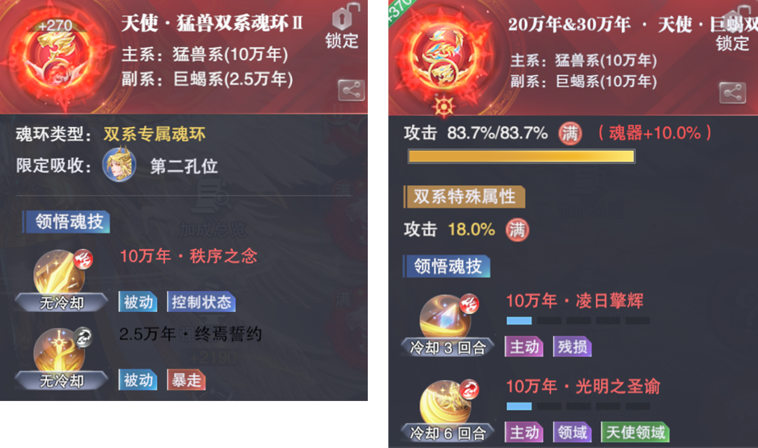 说完了魂骨,接着是2/4技能的双系魂环,其中4技能的双系魂环建议以4-2为主,注重长图输出同时提升更多的属性,而2技能是情况而定,2-1偏向PVP和短图,2-2则偏向长图,此外在长图中4技能可以带双系,但2技能却不要带,因为前期会浪费很多时间,这点大家切记,所以总体而言SP千仞雪的两个双系魂环最大的作用还是更多的属性提升,技能方面的实战影响着实一般。