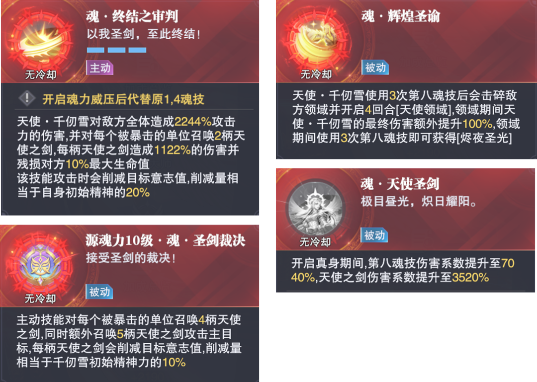 源魂力技可以额外提升8技能召唤的“天使之剑”的数量,在短图/PVP/活动副本中有非常重要的作用,例如目前的极限战境、外传副本等玩法,没有激活源魂力技的SP千仞雪可能就要落后很多回合了,这点大家需要特别注意