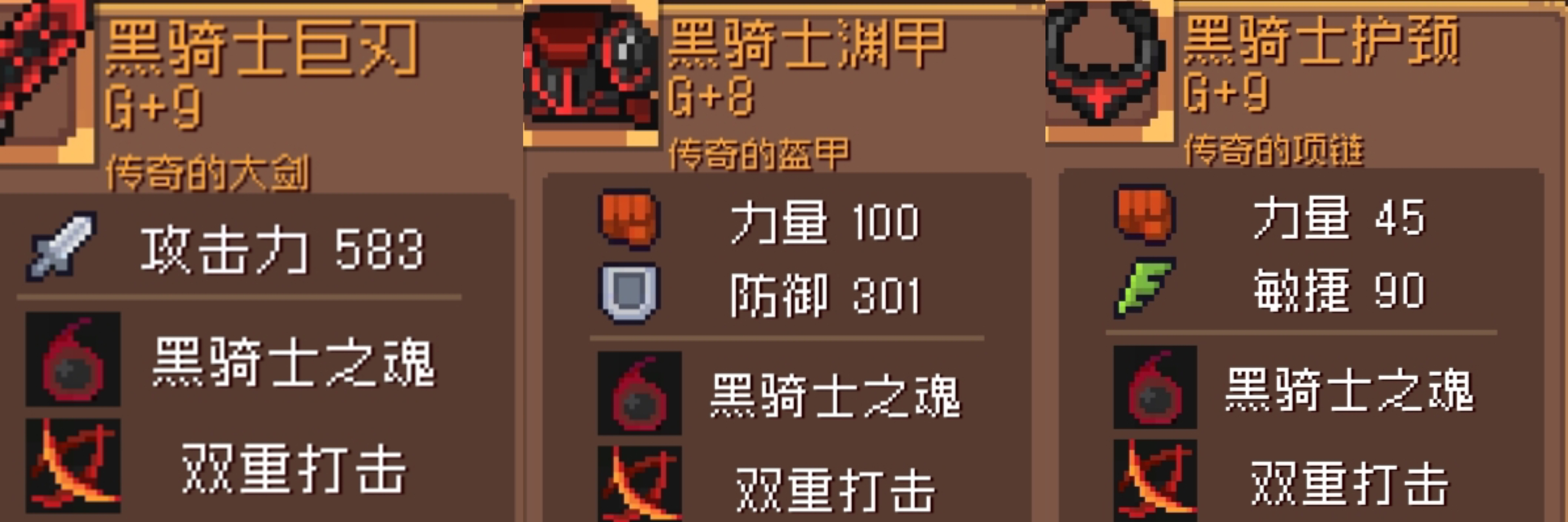 ⭐包括试炼塔排名前三名的玩家都是使用这个套装。黑骑士之魂的流血效果搭配上双重打击,打boss输出直接拉满,试炼塔的天花板套装。