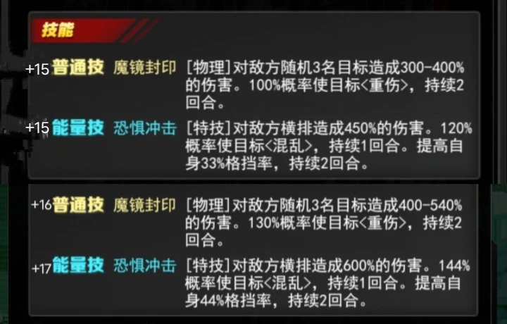 +15能量技 恐惧冲击[特技]对敌方横排造成450%的伤害。120%概率使目标<混乱>,持续1回合。提高自
