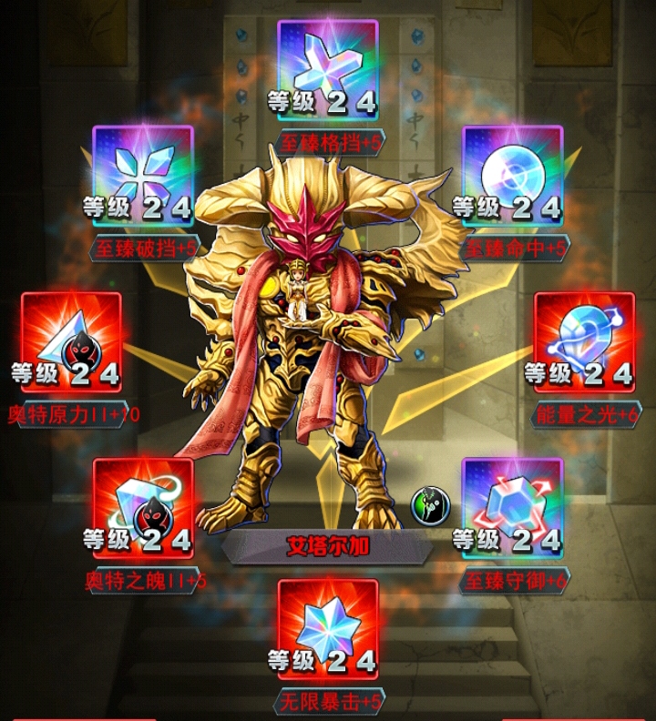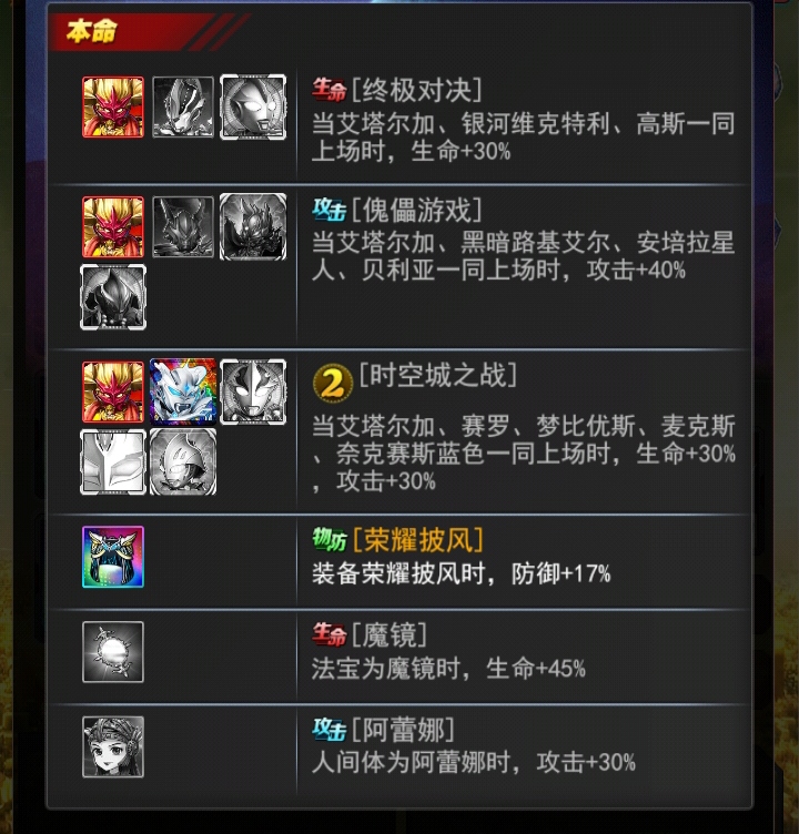 解析:若乙方角色少于4民对敌方全体造成低比例伤害高概率重伤持续一回合对敌方随机三名目标,所有伤害降低50%,这样的话就是降低敌方的伤害,提高自己的抗伤能力。这场战斗只会触发两次,这是第1个效果,第2个效果就是自身行动。乙方数量不足于4名,召唤一名场上的怪兽或者宇宙人的傀儡,并治疗自身50%的生命值,如果没有符合的话,就会恢复所有生命值,简单来说。就是数量不足于4名就可以复活一个角色,这个角色就相当于是低配版的逆转。这个复活谁都有可能有可能是炮灰,有可能是助力,但是这个角色一般复活都比较看脸,而且这个角色作为主推的话,复活的一定都是炮灰,所以效果就看自己想怎么玩了