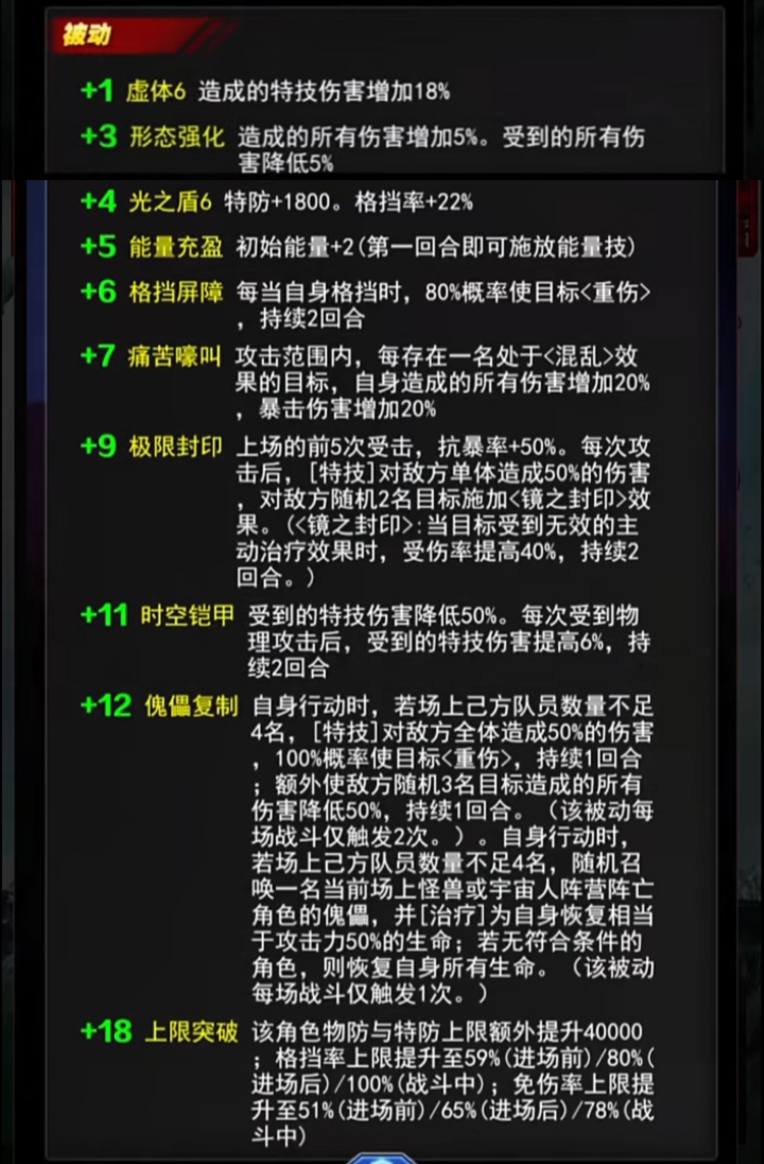 解析:上场前5次抗暴率增加50%,这个就相当于是一个能量反射5次就是250的抗爆率。这个抗爆的还是很不错的,每次攻击会施加一个对敌方单体造成低迷的伤害,对敌方随机两名角色施加一个buff,这个buff就是当目标受到无效的主动治疗时,受伤率提高40%简单来说就是第一敌方角色处于重伤的效果。第二就是会要获得这个buff第三就是对面的角色要用奥特之母或者妹妹的大招,这一类角色的大招属于主动剂治疗,这样才可以触发这个受伤率的增加。受伤率很高,但是出发概率不是很高