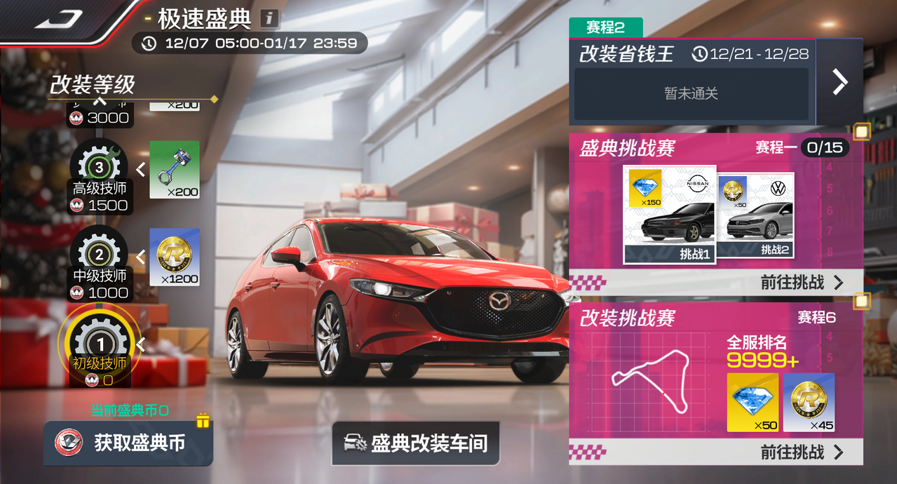 12月21日将开启【改装挑战赛】,你将与全服玩家共同参与为期4周,总计7个赛程的竞赛挑战。设计最适合你的改装方案,跑出你的最佳圈速,与全服玩家一争高下,领取丰厚钻石奖励!针对特定关卡,还有【改装省钱王】榜单等你来争霸,速度不再是唯一标准,以尽量少的盛典币冲击更高的成绩吧!