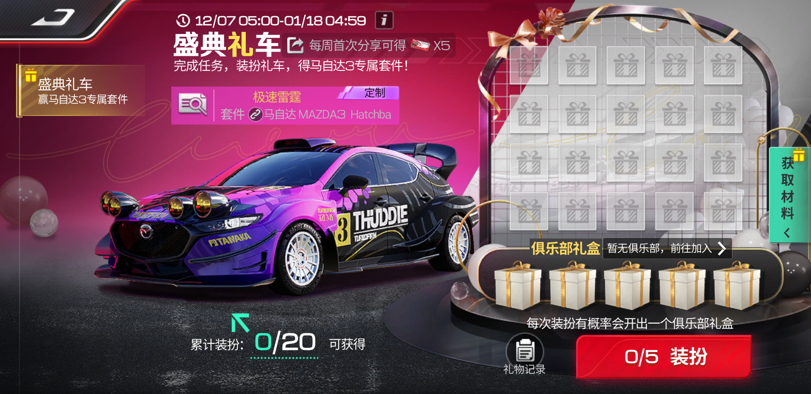 赛季期间,完成每周系列任务和限时挑战任务即可获取金币、钻石和装扮礼券。累计进行20次装扮,即可免费获得马自达 Mazda3 Hatchback '20专属套件奖励【极速雷霆】!装扮礼车时,还有惊喜彩蛋——俱乐部礼盒等你来解锁,为俱乐部全体车手送上礼物祝福,共襄盛典!