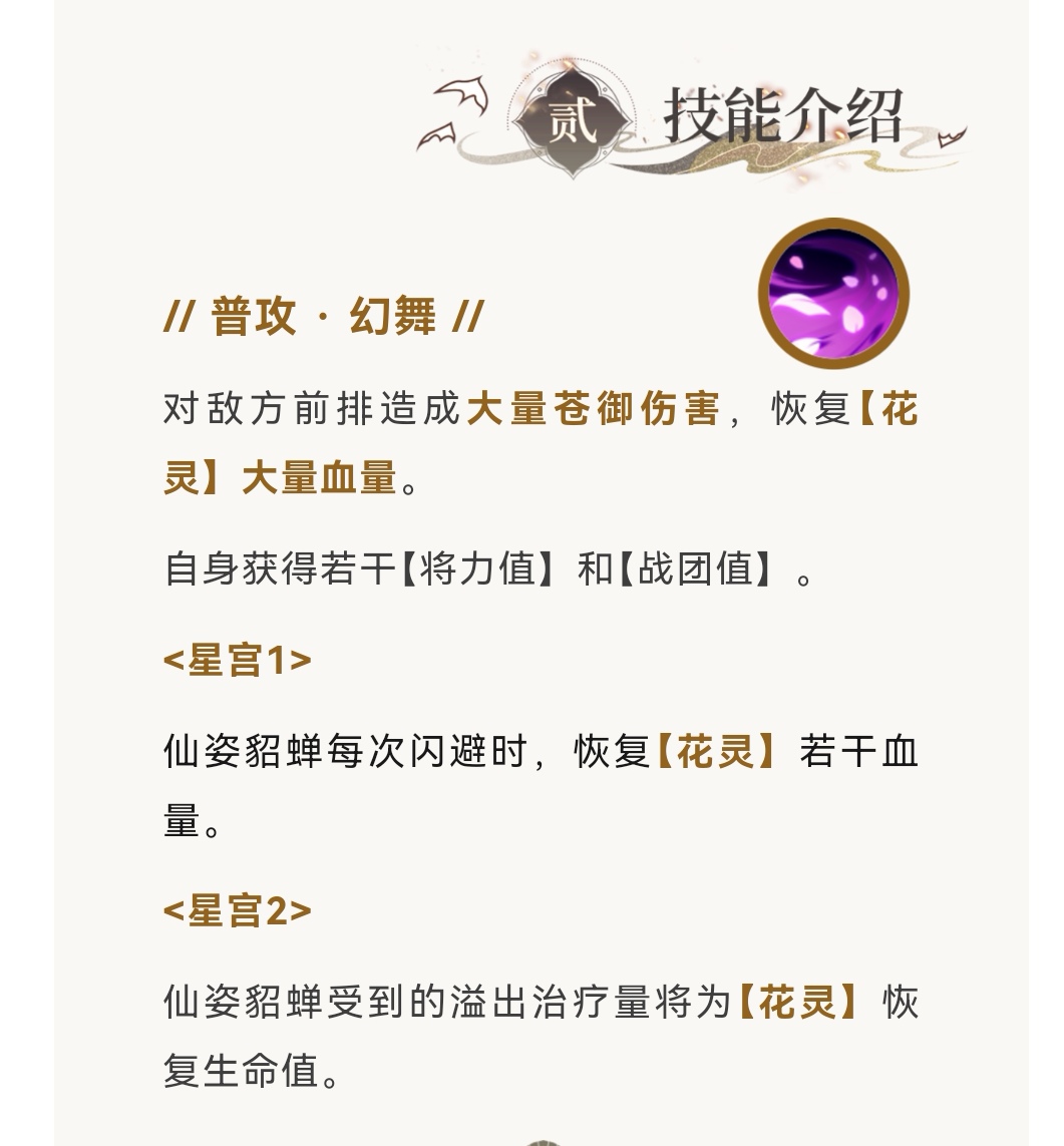 星宫1(仙姿貂蝉每次闪避时,恢复“花灵”若干血量。)
