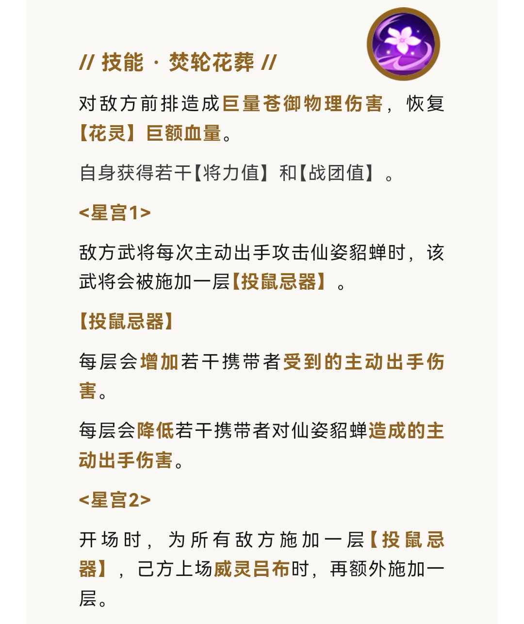 星宫1(敌方武将每次主动出手攻击仙姿貂蝉时,该武将会被施加一层“投鼠忌器”。)