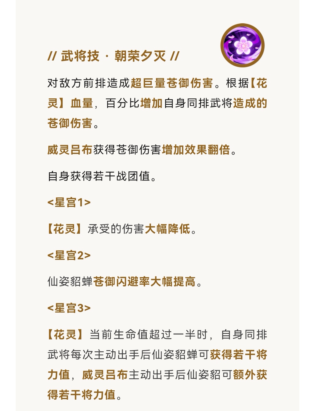 武将技:对敌方前排造成超巨量苍御伤害。根据“花灵”血量,百分比增加自身同排武将造成的苍御伤害。威灵吕布获得苍御伤害增加效果翻倍。自身获得若干战团值。