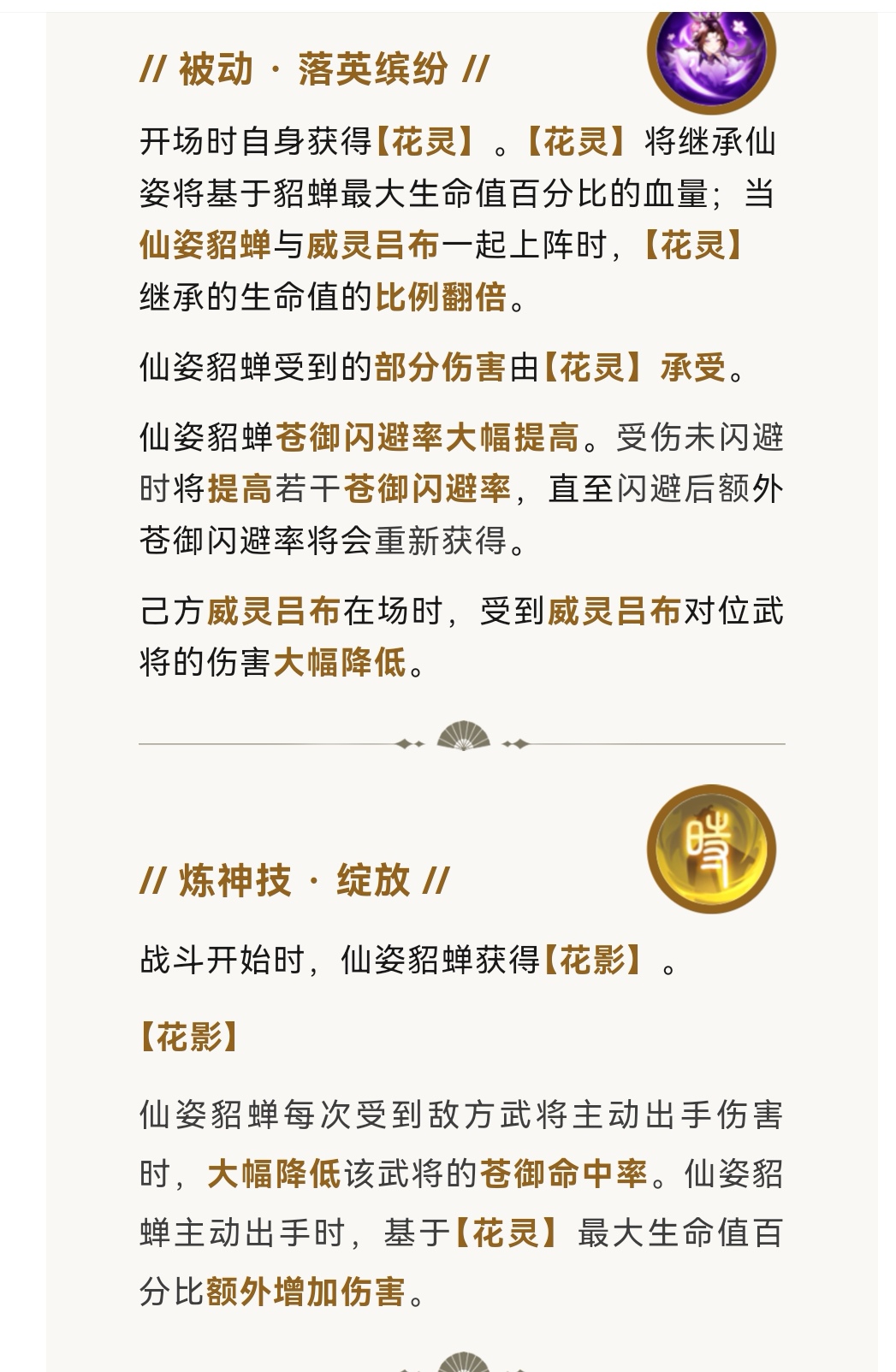 核心:花灵(开场时自身获得“花灵”。“花灵”将继承仙姿将基于貂蝉最大生命值百分比的血量;当仙姿貂蝉与威灵吕布一起上阵时,“花灵”继承的生命值的比例翻倍。