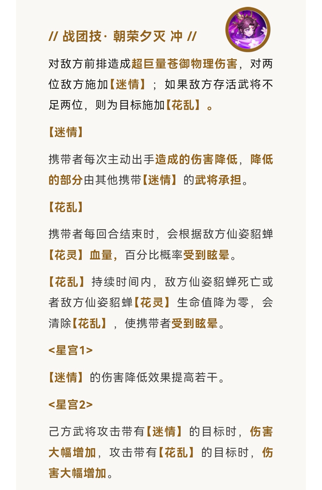 星宫2 己方武将攻击带有“迷情”的目标时,伤害大幅增加,攻击带有“花乱”的目标时,伤害大幅增加。