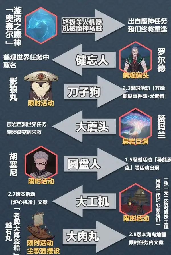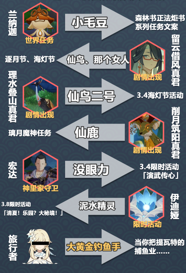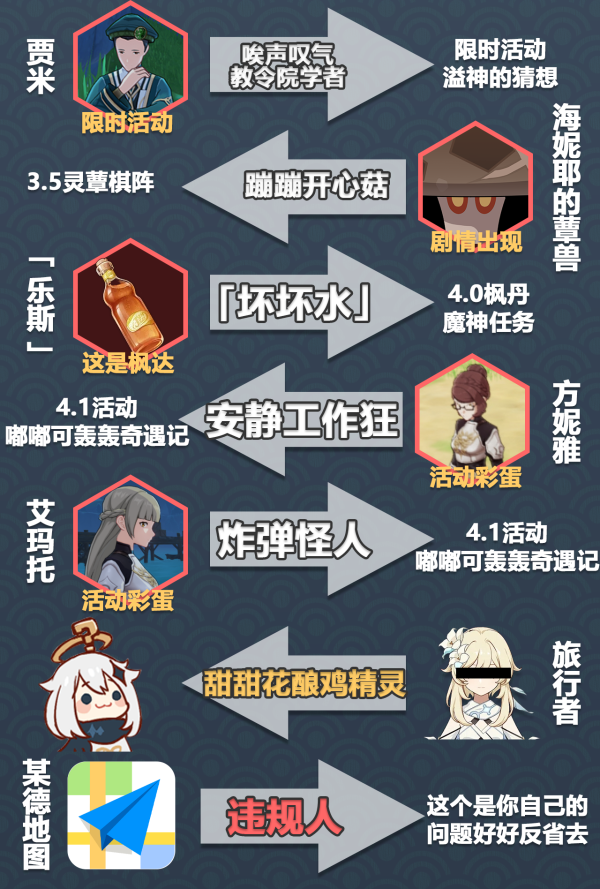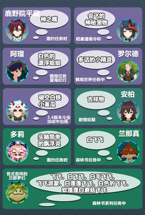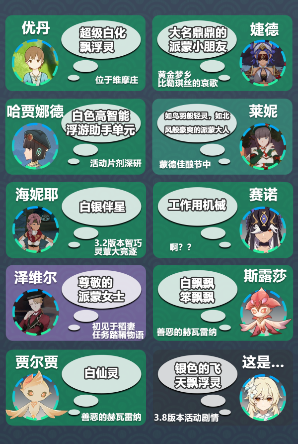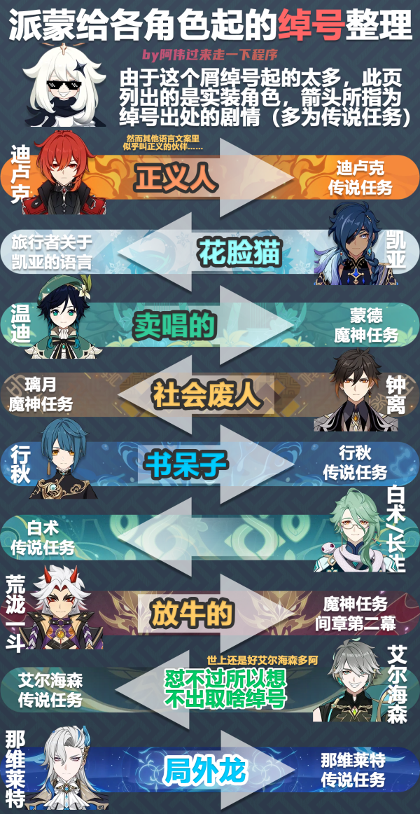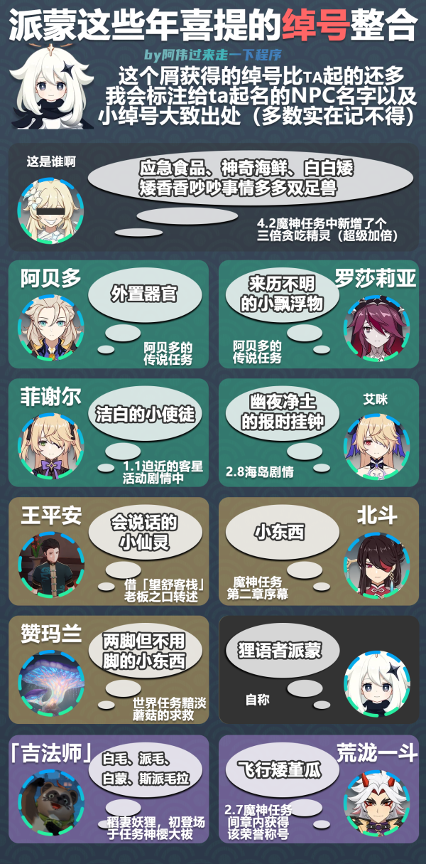 杂谈丨派蒙这些年喜提的绰号&给其他人起的绰号原神 - 新闻星发布于 2023-12-04关注 虽说派蒙这家伙喜欢给别人起绰号,但实际上由于过于奇特的外形和行走(迫真)方式,他被别人起的绰号甚至比自己起的还要多。本篇内容大致统计了下派蒙这个有机食品在各剧情中涉及到的各种小绰号,并标出了对应起名的角色/NPC名称。 作者:原神西风驿站,阿伟