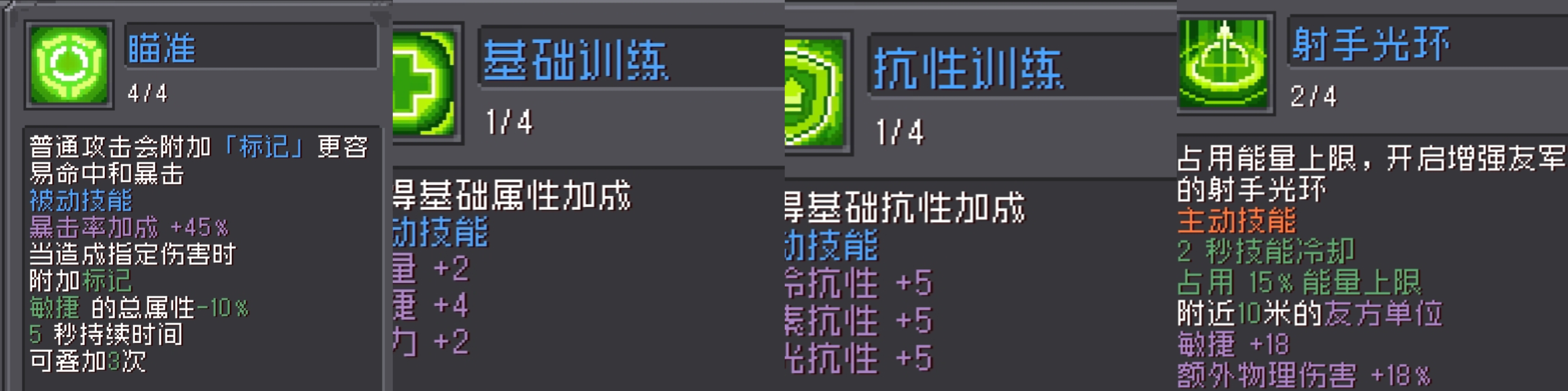 ①射手技能栏加点推荐:瞄准(加满)+基础训练(加满)+抗性训练(加满)+射手光环(加满)+穿透箭(2级)。