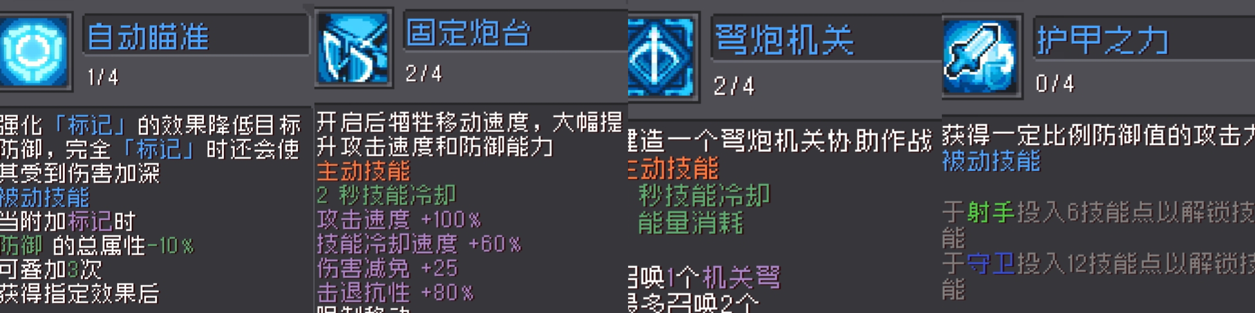 ②堡垒—技能栏加点推荐。自动瞄准(加满)+固态炮台(加满)+机关炮(加满)+箭雨(加满)+护甲之力(加满)