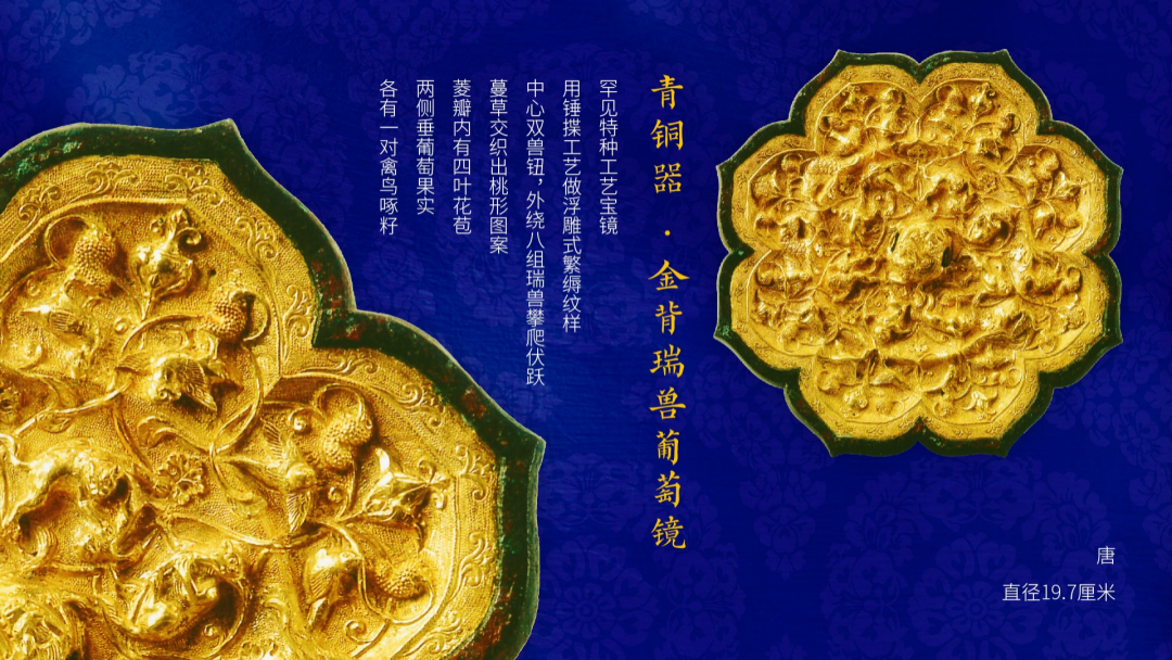 「金背瑞兽葡萄镜」是上层社会使用的的器物,其镜背上的花纹图案再现了精湛的工艺和奢华的造型,是唐代盛世文化的一个缩影。