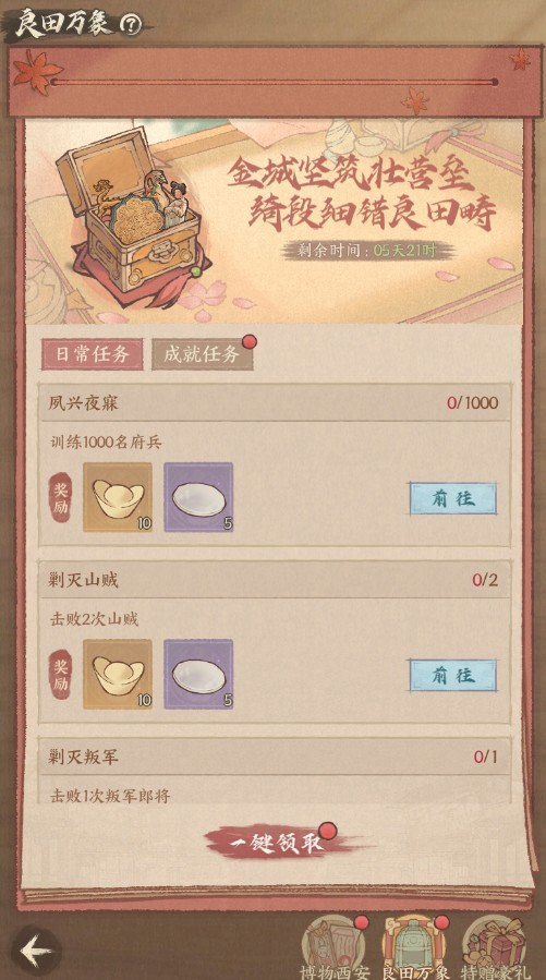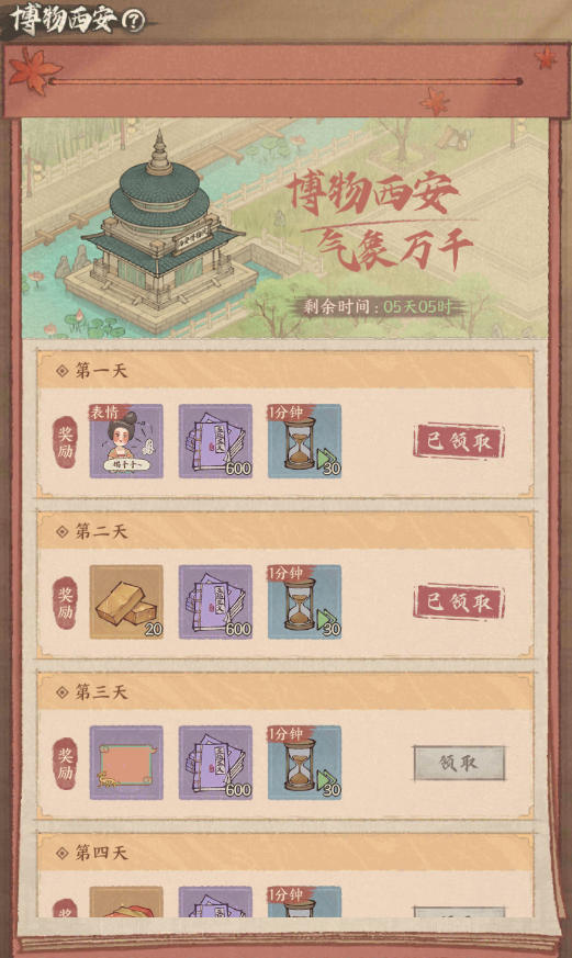 活动规则:城主们每日登录游戏即可领取对应奖励1份。累计登录7天即可获得「博物·西安」书阁皮肤、联动表情包、联动气泡框、御窑金砖、随机红品书籍等好礼~