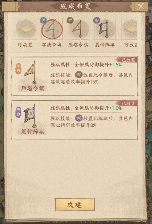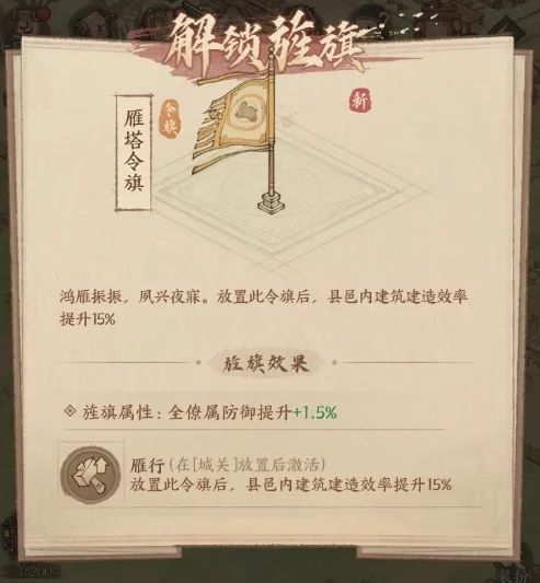 玩家可以通过在城关城墙上树立【旌旗】来有效提升僚属、戎车实力、建筑生产加成,而不同旌旗有着截然不同的加成。