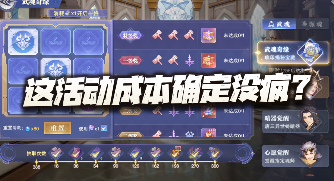 总体而言,此次活动的耗钻特性非常明显,其特等奖的成本非常之高,仅次于魂铠级别的资源成本,大家请量力而行,当然如果你抽不到特等奖的保底次数且又一定要去冲的话......就当成补几个戗敌魂髓也行......