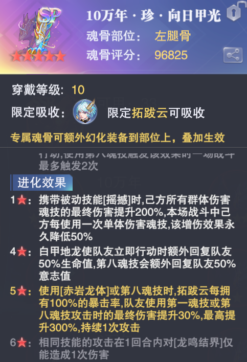 然后是拓跋云的这块进化魂骨,这个进化魂骨是在今年周年庆期间上线的一个非常恐怖的进化魂骨,没有这块魂骨的拓跋云其实还可能不如海马,但有了这块魂骨至少10倍以上的增伤辅助后,拓跋云就彻底拉海马不止一条街的差距了,不过这块进化魂骨大家需要注意手法的操作,单体技能会让其增伤降低不少,普攻不算单体技能特此提醒,另外这个红色1星效果配合SP宁荣荣的【神恩】是可以永久保留的。