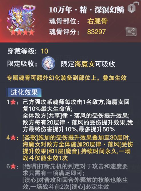 然后另一个可选的海魔女进化魂骨,这个就已经返场过不少次了,对于海魔女来讲是质变,但是目前有了这个进化魂骨的海魔女也比不过同练度下的SP波塞冬,大家注意即可,此外这个进化魂骨对于PVP也有一定的增益,效果还行,大家参考即可。