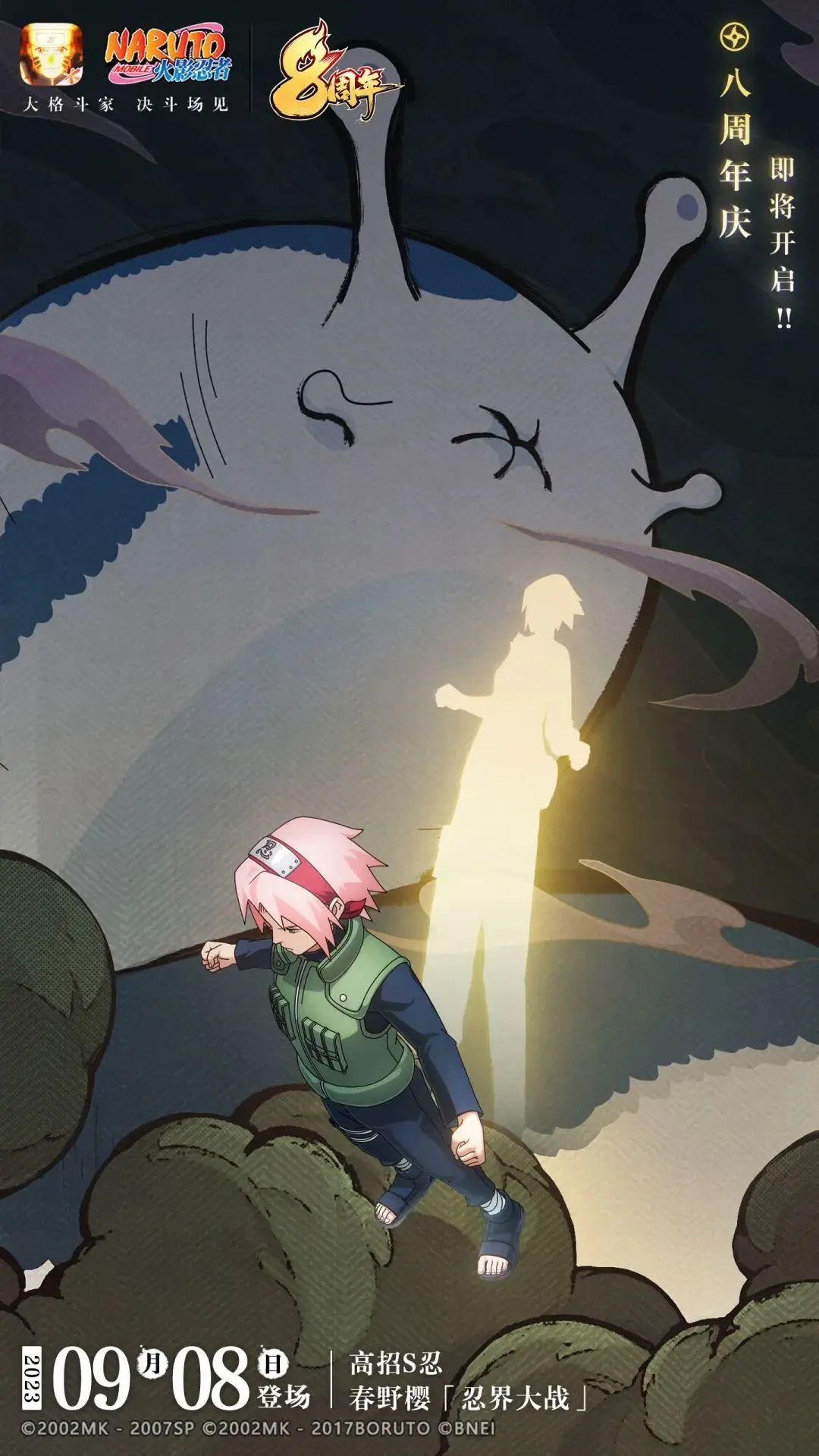 八周年庆典将启八周年庆即将开启!丰厚福利强力来袭!回顾2023年,在9月8日,春野樱高招S忍形态——春野樱「忍界大战」正式登陆决斗场,解除阴封印,全力出击!