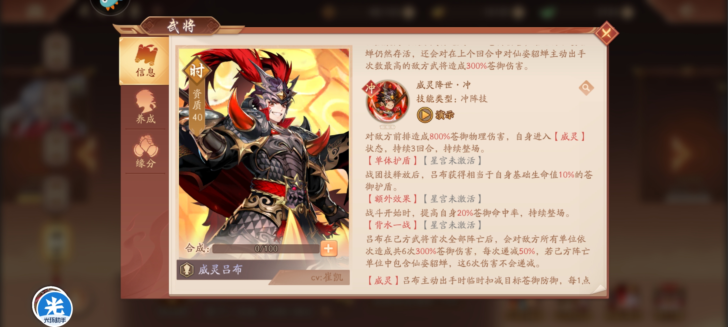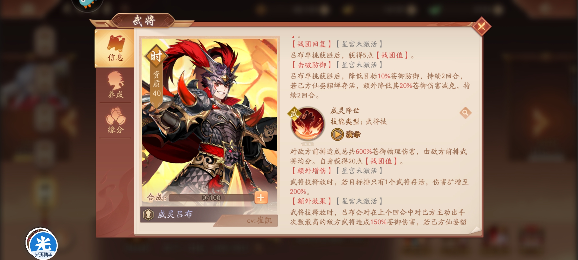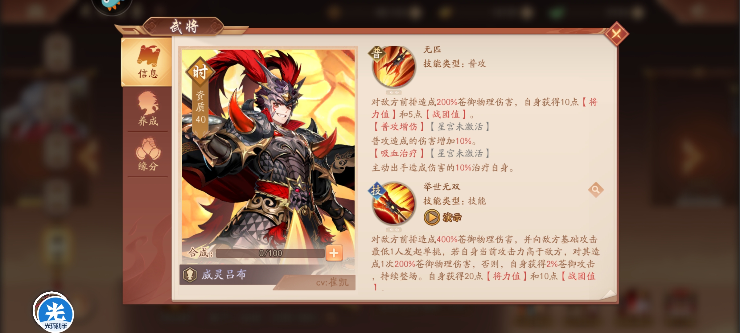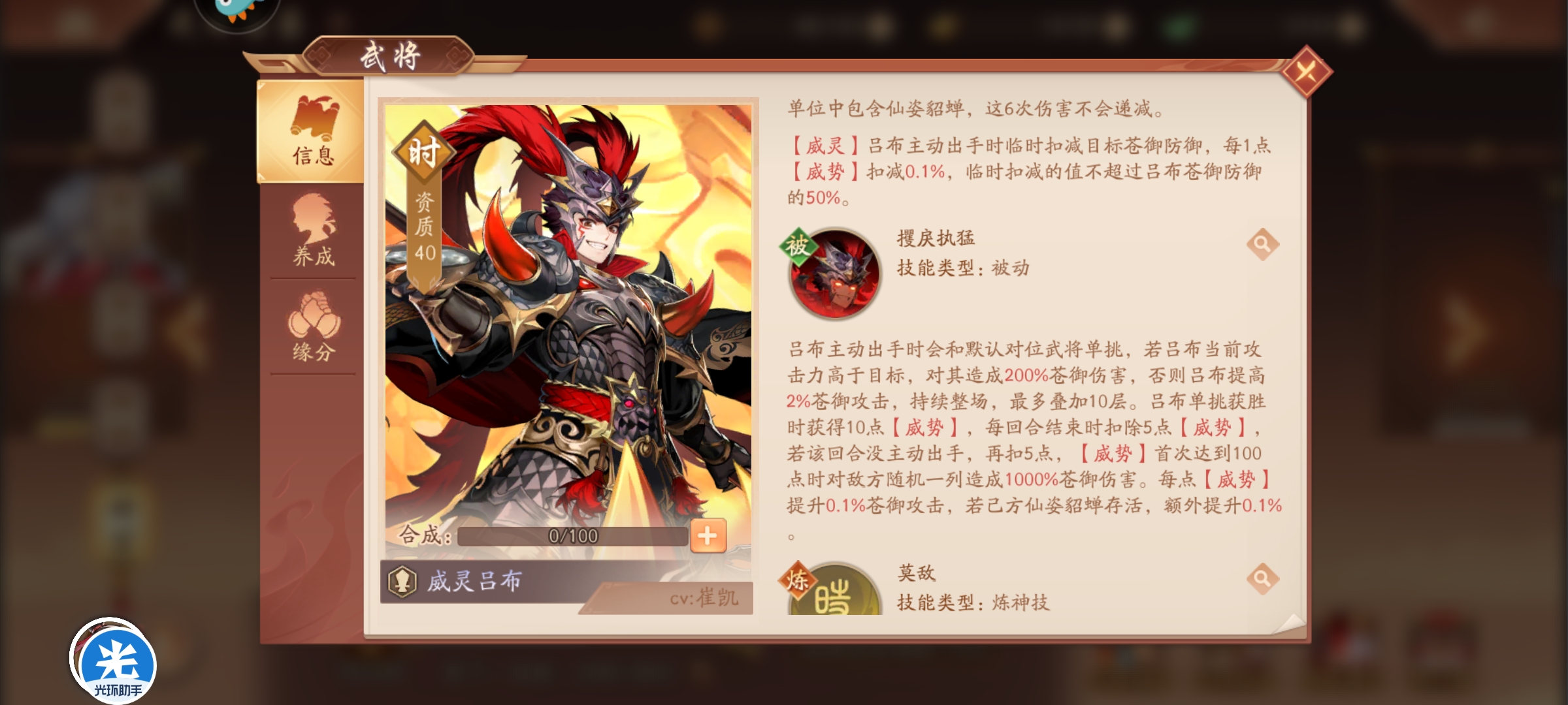 被动攫戾执猛吕布主动出手时会和默认对位武将单挑,若吕布当前攻击高于目标,对其造成200%苍御伤害,否则吕布提高2%苍御攻击持续整场,最多10层。