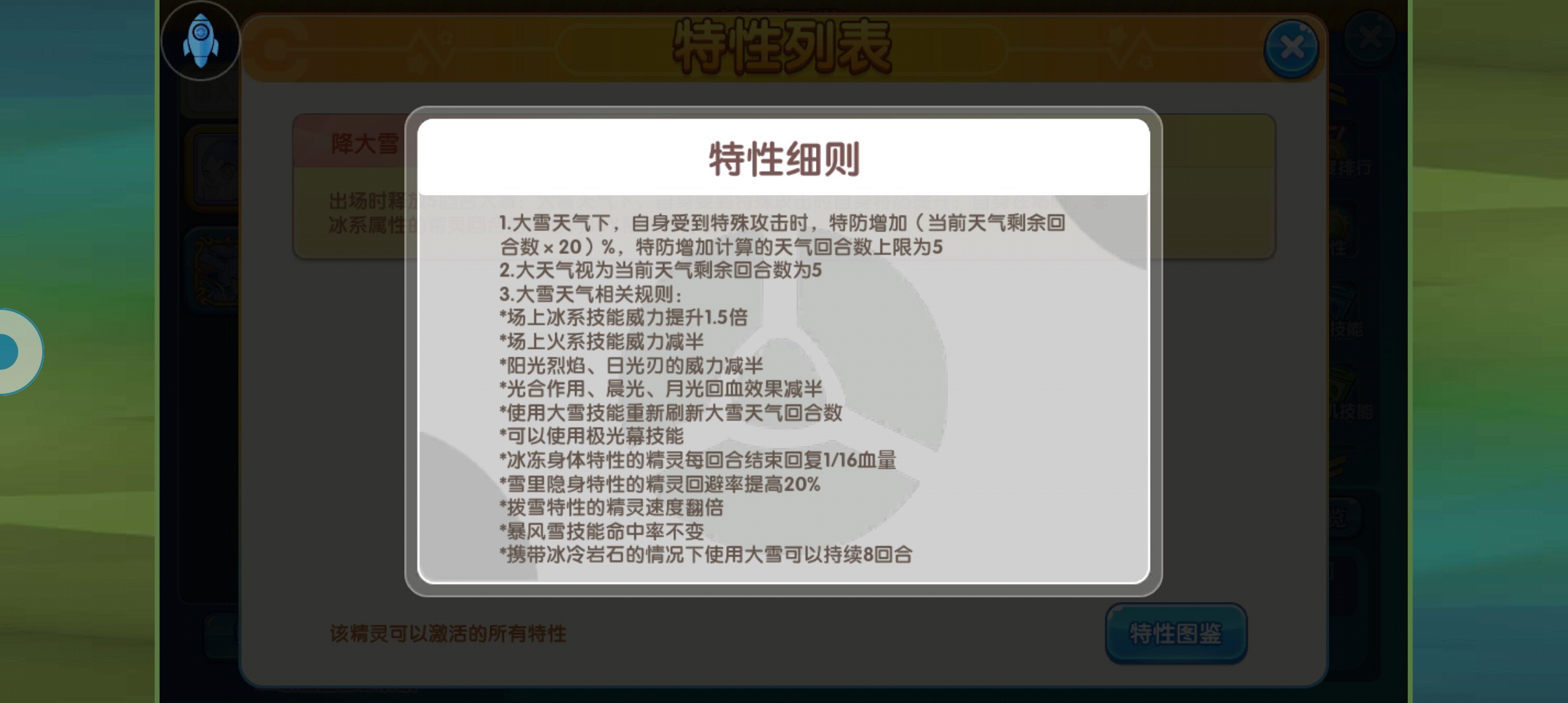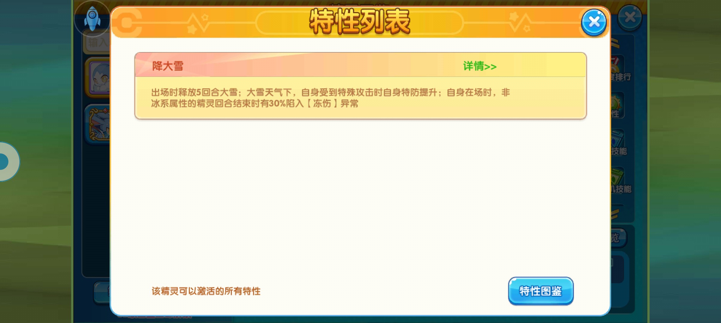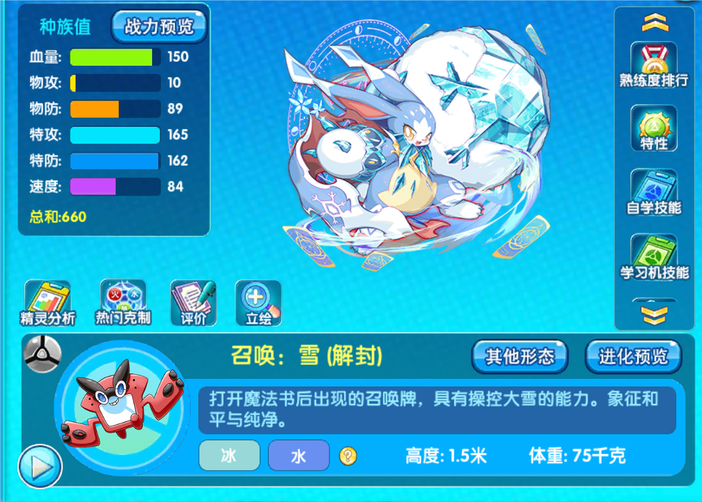 从特性上方来看,又是一个老特性得到的强化,而且这个特性可以进一步提升该精灵的特防能力,只要大雪天气越多,自身的特防就越高,并且非冰系精灵会在回合结束阶段,有30%的概率陷入冻伤状态,冻伤状态的精灵会进一步降低自身的特攻伤害,并且会持续扣血,有了这个天气,一旦对方的精灵全部都是特攻,那么基本上召唤雪的强度,可以说是在金字塔尖的,反过来说,对方的队伍都是物理输出的话,那这个精灵就很尴尬了,只能赌对面陷入冻伤状态,然后慢慢的扣血,其他的毫无用处,除非自身的队伍是冰属性的队伍。