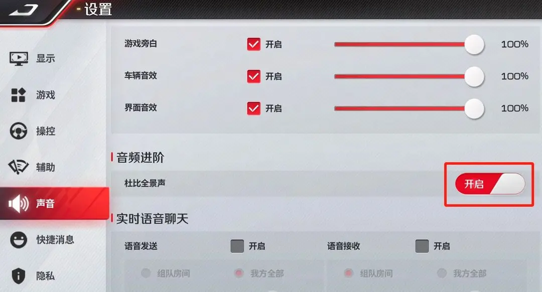 12月7日新赛季更新后,打开设置-声音-音频进阶-杜比全景声-开启,即可享受沉浸式声音体验。