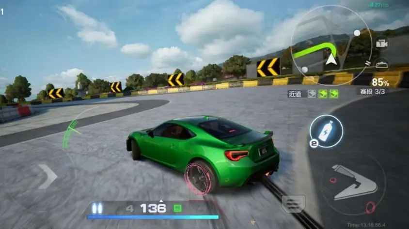 2. 惯性漂移:适用于小角度高速弯道,是游戏中的基础漂移技巧,只有在车速达到160km/h以上才可触发,操作方法为:1按住方向键的同时,先点击脚刹、再点击油门。此时角度标尺区间显示为白区,增加漂移角度即可变为绿区。