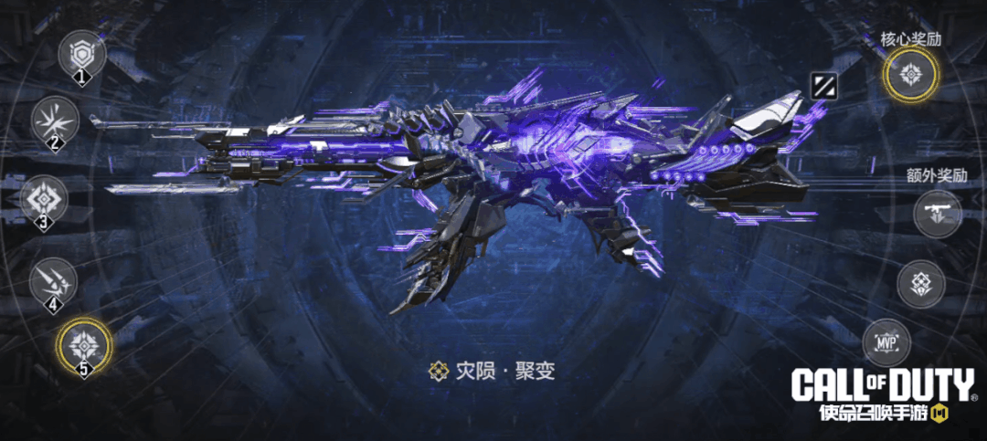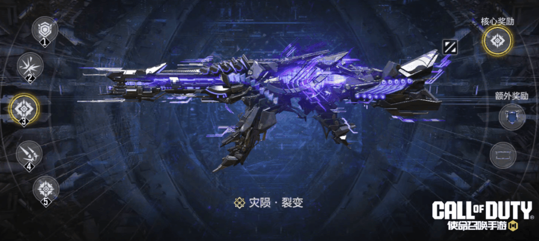 等级三解锁专属神话淬形,武器外观进一步升级,枪口、枪托、弹匣处所覆盖的外骨骼展开,枪身内部的新型能源释放而出,紫色电流不断由外向内汇聚,发生裂变反应。充盈的能量让枪身周围布满了紫光纹路,使得整把武器看起来更有侵略性。