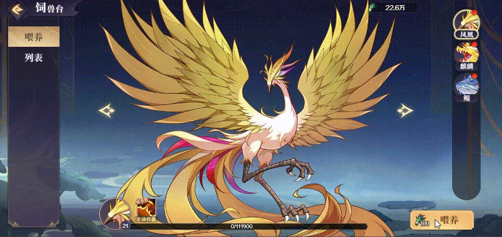 你可以在“饲兽台”中喂养祂们,提升各项属性将会加成到战斗中的英雄们身上,为了节省大家时间,我们贴心地赋予同种族灵兽的血脉相通的属性,只需喂养一次,同族飞升~